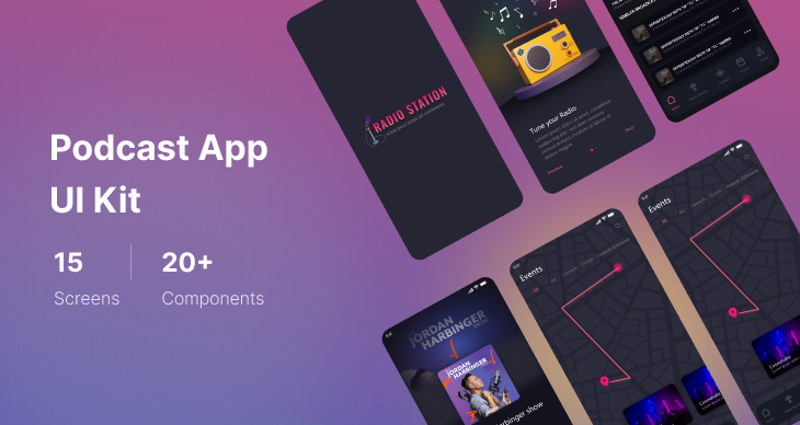 The Podcast is a free app UI kit that you can use to create your own podcast, radio, and music player app within just minutes. It comes with a dark color theme and super clean interfaces, packing a total of 15 pages, such as:
