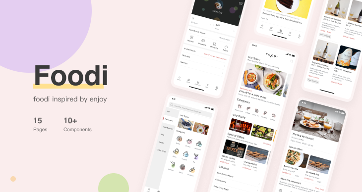 This app UI kit is inspired by a popular food app called "Foodi", which helps users find the food they love with ease. It offers a complete set of interactive components, controls and pages to help you create your own food or food delivery app in the shortest time.