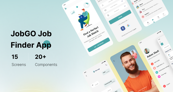 This free UI Kit is perfect for a job finder app. It features finding jobs near you by search filter and also will notify you of exciting opportunities. To apply, simply click on the job you want and push the ‘Apply Now’ button to get matched with an employer. You can also chat instantly with employers through the app to get your dream job. This UI Kit comes with 15 pages, including: