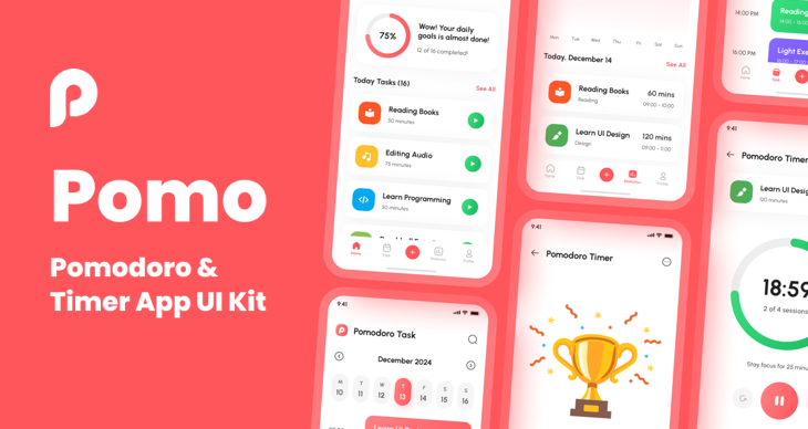 Promo is a modern app UI kit suitable for the design of Pomodoro, Timer, Reminder, Task Management, & Productivity apps. It is pretty clean and simple, and comes with a total of 15 pages, like: