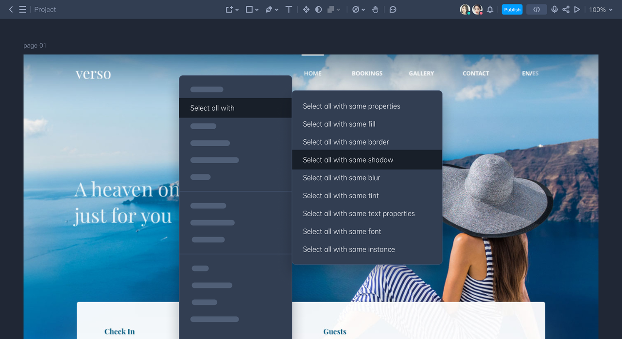 Mockplus DT now let you quickly select a bunch of layers with the same characteristics, without having to manually find and select them one by one as before. For example, you can choose to select all layers or objects with the same fill, shadow or properties in just one click on the layer panel.