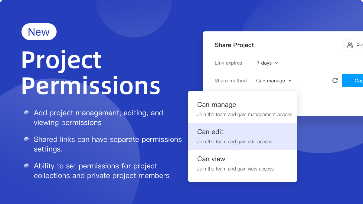 To provide our users with a safer and more efficient way to share and manage projects and project folders, we've introduced a new system of project access permissions. You can now assign different access levels, such as "Can View," "Can Manage," and "Can Edit," to your team members when sharing projects or managing project and project folder members.