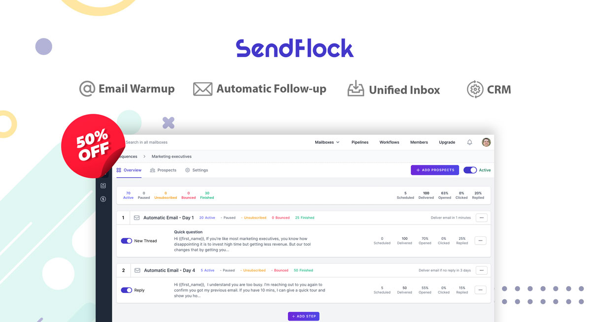 SendFlock is an email warm-up and cold email automation software. It helps SaaS companies get customers without spending money on paid ads or content marketing. SendFlock will be a good option if you want to acquire customers at a low cost.