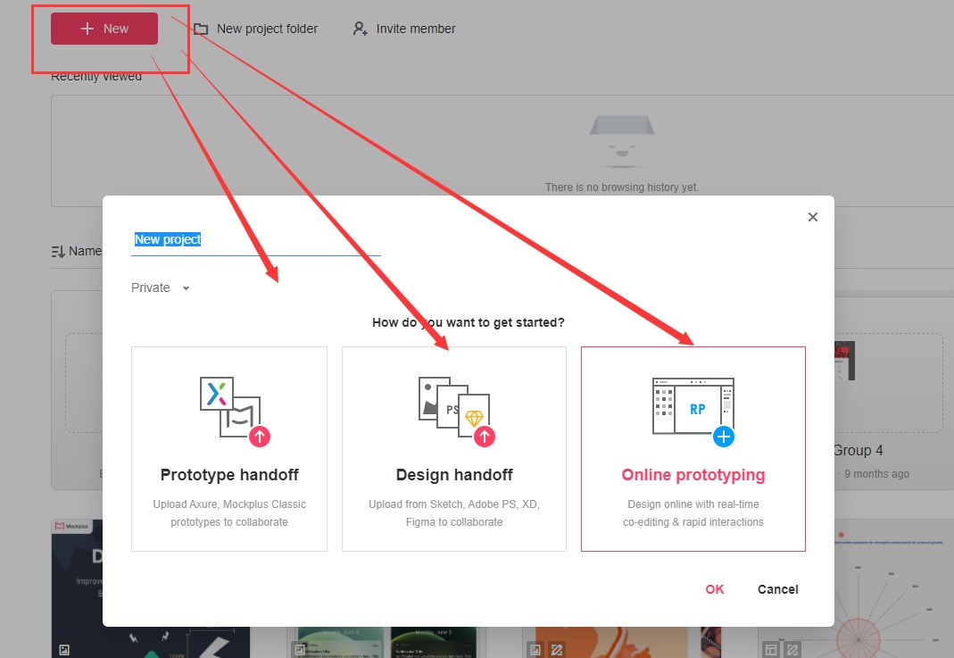 Right now, when you are trying to create a project on Mockplus Cloud, you'll find there are three options as below: