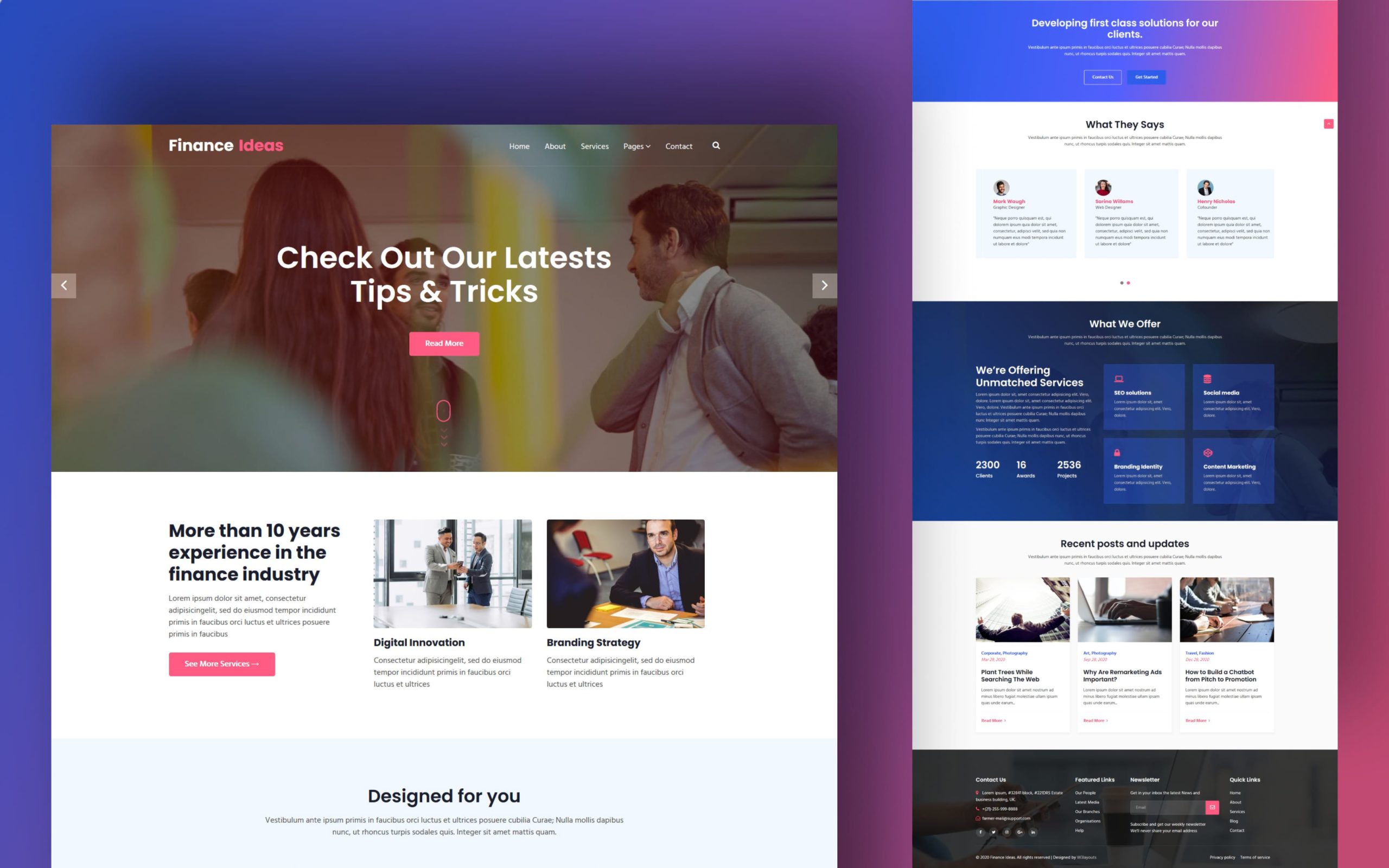 Finance Ideas is the corporate category website template used to build the finance consulting corporation or any corporate related website for growing your business online. The gradient finish garnishes the template makes it a more attractive website template. It also comes with a blog posts page where you can update the daily news and share about the pets.