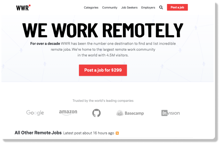 We Work Remotely stands out as a premier marketplace for remote job seekers, catering primarily to those in search of full-time or part-time remote positions while also offering opportunities for freelancers. It offers job opportunies for design, programming, and management, featuring positions from reputable companies such as Google and Amazon. Unlike many other job sites, freelancers are not required to create profiles to apply for jobs on We Work Remotely. Moreover, this site offers a filtering system that screens out substandard job opportunities by charging businesses a significant posting fee. Consequently, freelancers are more likely to access to high-quality job postings.