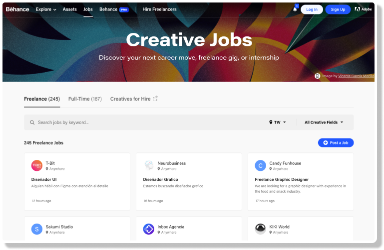 Behance, created by Adobe, serves as a platform for creatives to showcase their work and explore a multitude of job opportunities, ranging from freelance gigs to full-time positions, including illustrations, web design, app development, graphic design, and beyond. Completing your Behance profile with exceptional project samples exposes your work to a community of like-minded creatives and catches the eye of potential clients.