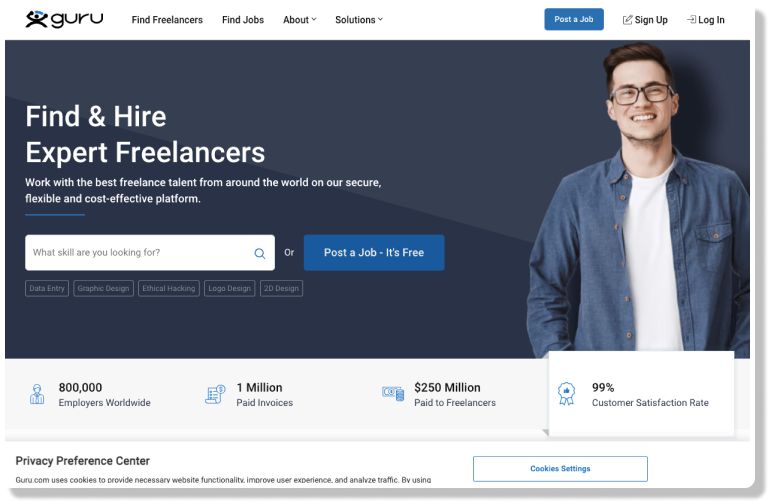 Guru is a global freelancing platform for freelancers in diverse fields such as programming, graphic design, and project management. It has over 800,000 employers wordwide. The platform streamlines the process for freelancers to showcase their expertise, browse job listings, and submit proposals to potential clients. It employs a matching system to suggest job opportunities tailored to freelancers' work experience, skills, and preferences.