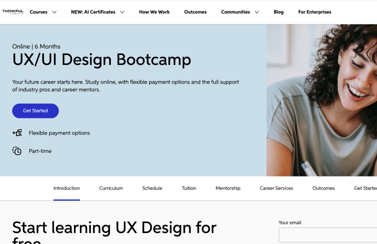 Established in 2012, Thinkful is a leading online learning platform offering coding, UX/UI design, and data science programs globally. With a focus on personalized education, Thinkful offers flexible and immersive courses catering to both full-time and part-time students. This UX/UI Design Bootcamp, completed in 5 months for full-time students and six months for part-time students, provides dedicated learning assistants and optional office hours with industry experts. You'll also get personalized career coaching. You’ll be assigned a mentor whose focus is on getting you hired and helping you build a profile that best shows off your skills and strengths.