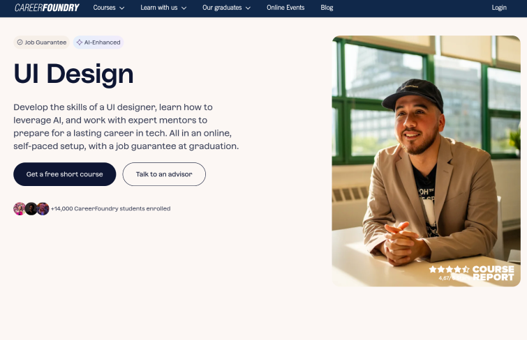 This course is beginner friendly. It is an online course that takes students from beginners to job-ready designers in nine months. Most students devote 15 - 25 hours per week to complete the course. In this course, you’ll adopt a design-thinking mindset, become AI savvy, and learn how to create more personalized, intuitive, and engaging user experiences. This course includes 1:1 mentorship. Your mentor will help you define your path, knock down obstacles, and meet your goals. And this course als comes with a job guarantee. If you put the work in and don’t land a job, it will give you a full refund.