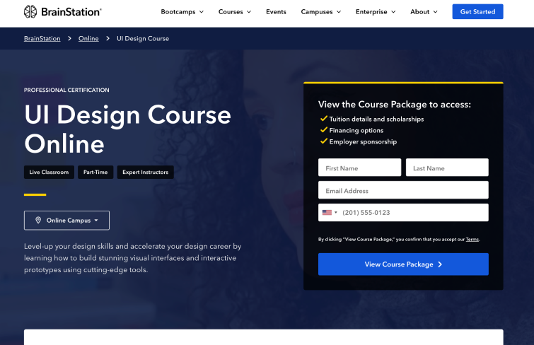 BrainStation's 8-week UI Design Course equips students with interface design principles, industry tool proficiency, and the skills to craft effective user interfaces. Through four units covering UI design principles, visual design, responsive design, and career development, you can learn from experienced designers, including professionals from Google, Facebook, and IBM. By course completion, students have developed a stunning UI design portfolio and received a recognized certificate, enhancing their job prospects in the design industry. Upon completing BrainStation's UI Design Course, you'll receive an industry-recognized professional certificate to share with your network and showcase all that you've learned.