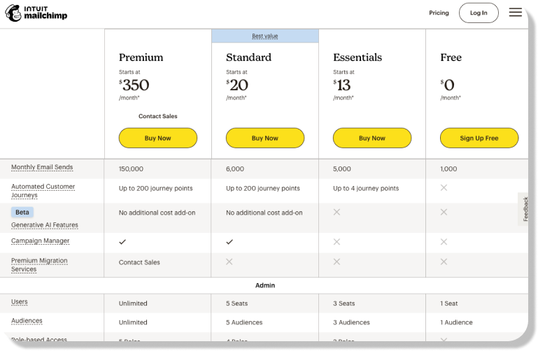 Mailchimp's pricing page stands out for several reasons. Firstly, it presents a visual representation of feature availability across all offered plans, enabling users to easily see the differences between offerings. Moreover, the page strategically highlights features available on all plans, emphasizing the comprehensive value customers receive regardless of their chosen plan.