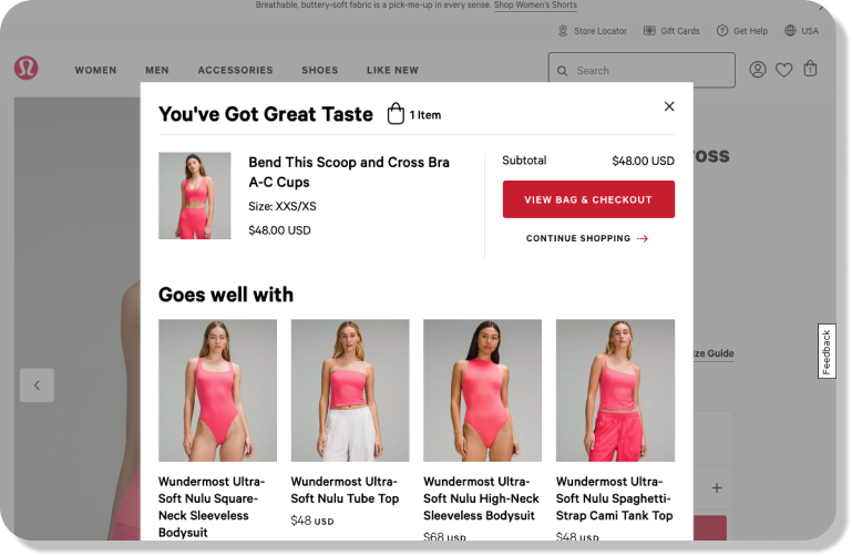 Additionally, Lululemon's checkout button stands out with its large, brightly colored design, capturing users' attention and guiding them to proceed with their purchase. Furthermore, the recommendation of complementary products encourages customers to explore additional offerings, promoting continued engagement and potential upselling opportunities.