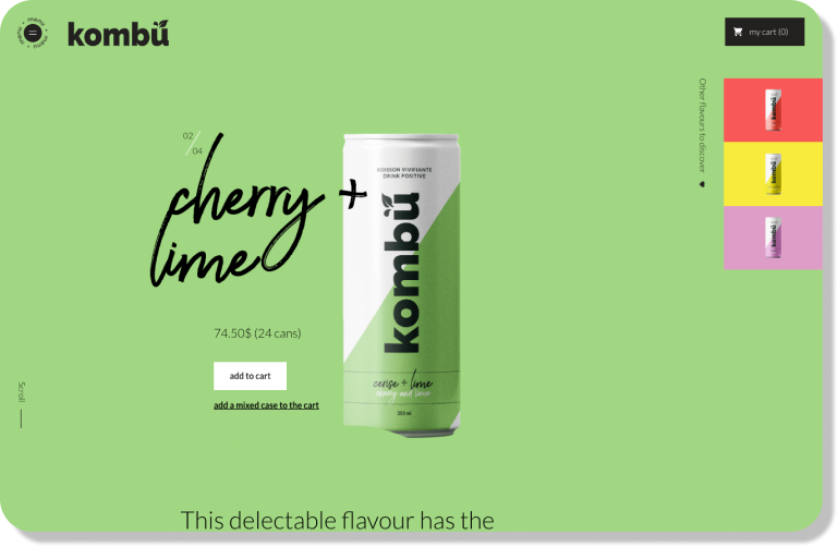 Kombu, a beverage company, demonstrates the power of departing from traditional product page layouts with its bold design. It embraces boldness and innovation, particularly when aligned with the brand's identity, to differentiate oneself in the market and leave a lasting impression on consumers.