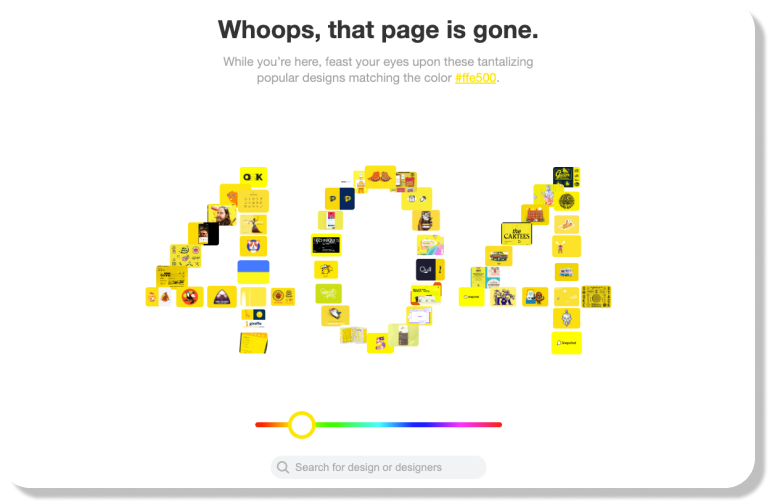 Dribbble's 404 page ingeniously directs users towards designs sorted by color instead of simply redirecting them to the homepage. This aligns perfectly with Dribbble's core mission of showcasing design work, showcasing their commitment even on error pages. Users are presented with the option to explore designs by color preference or utilize the search function to find specific designs or designers.