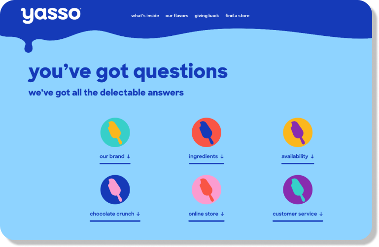 Yasso's FAQ page incorporates the brand's colors and design elements, enhancing brand recall and cohesion throughout the user experience.