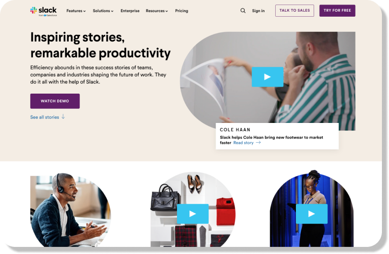 Slack organizes its customer testimonials under the section titled "Customer Stories," featuring one company per post. Each testimonial highlights key product features and demonstrates how the customer utilized them, effectively providing a product tour while allowing satisfied customers to endorse the platform.
