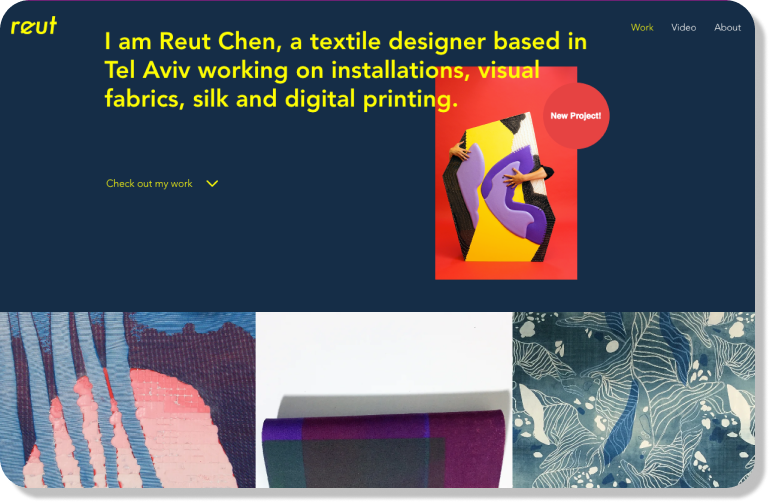 Reut Chen, a textile designer, opts for a classic grid layout on her portfolio website, where geometric building blocks contrast with her works' organic, textured, and handmade feel. The website's simple, distraction-free design allows her art to take center stage. Breaking away from the grid, she highlights a new project at the top of her homepage, offering visitors insight into her current explorations.