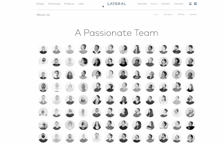 Lateral's "Meet the Team" page offers a refreshing and innovative approach compared to conventional ones. Instead of a plain list of names and titles, the page utilizes creatively captured images to showcase each team member's personality and humor, providing a glimpse into the company's culture and ethos.